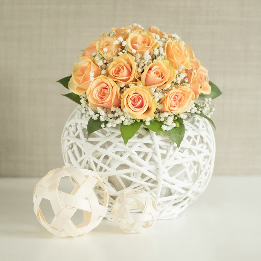 We've carefully choosen orange roses and gypsophila flowers to make an alluring flower arrangement, perfect for your wedding event.